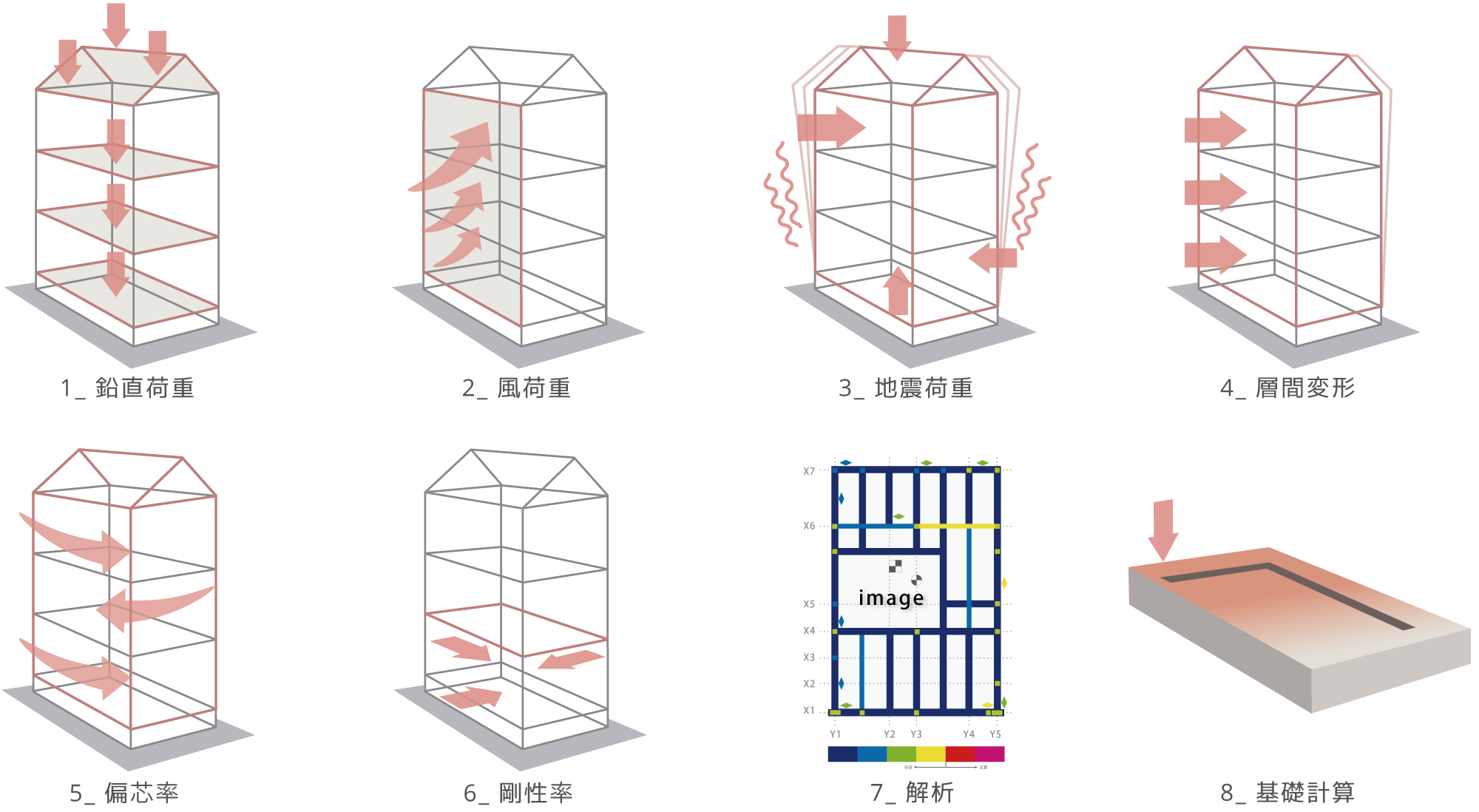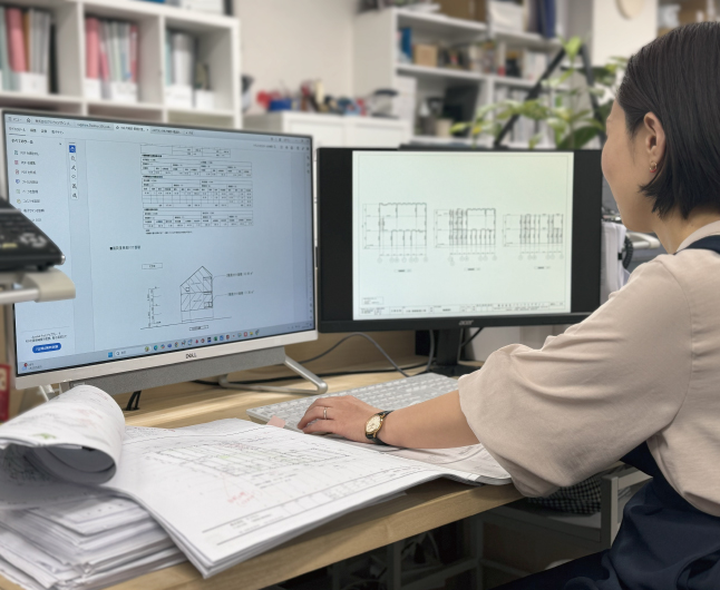 この計算方法では、層間変形や偏心率、剛性率といった構造の挙動に加え、鉛直荷重、風荷重、地震荷重など、建物にかかるさまざまな力を詳細に解析します。基礎設計から壁のバランス計算、柱の接合部や水平構面に至るまで、建物全体のバランスと耐久性を考慮して、地震や強風に耐えうる設計を行います。
